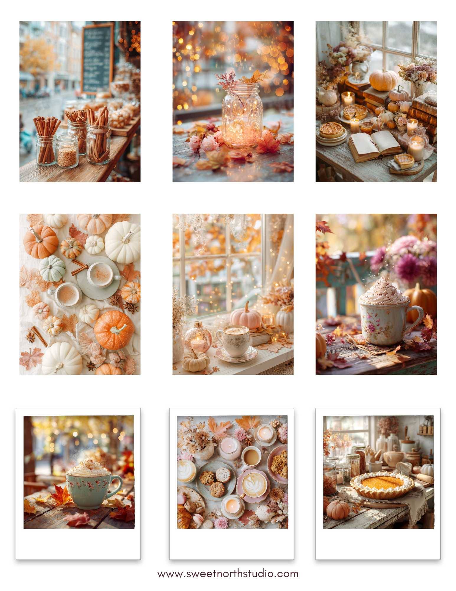 Add a touch of pumpkin spice to your creative projects! This free printable sheet has 9 aesthetic photos perfect for autumn themed junk journals or scrapbooks.